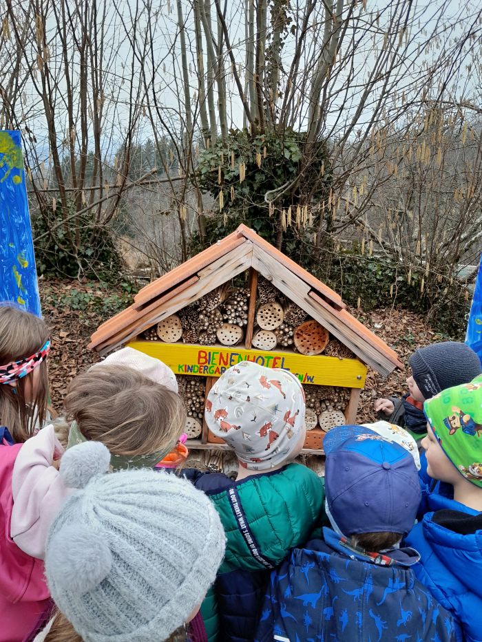 Wieder einmal besuchten wir das Bienenhotel, welches wir mit Gerhard Ehrenhöfer und seinen KollegInnen vom Bienenzuchtverein gebaut haben. Voller Freude entdeckten die Kinder neue Bewohner darin. Außerdem konnten die Kinder die ersten Frühlingsboten auf der Wiese finden. Im Kindergarten ist es uns sehr wichtig, dass die Kinder die Jahreszeiten mit allen Sinnen erleben und ihnen der achtsame Umgang in und mit der Natur näher gebracht wird.